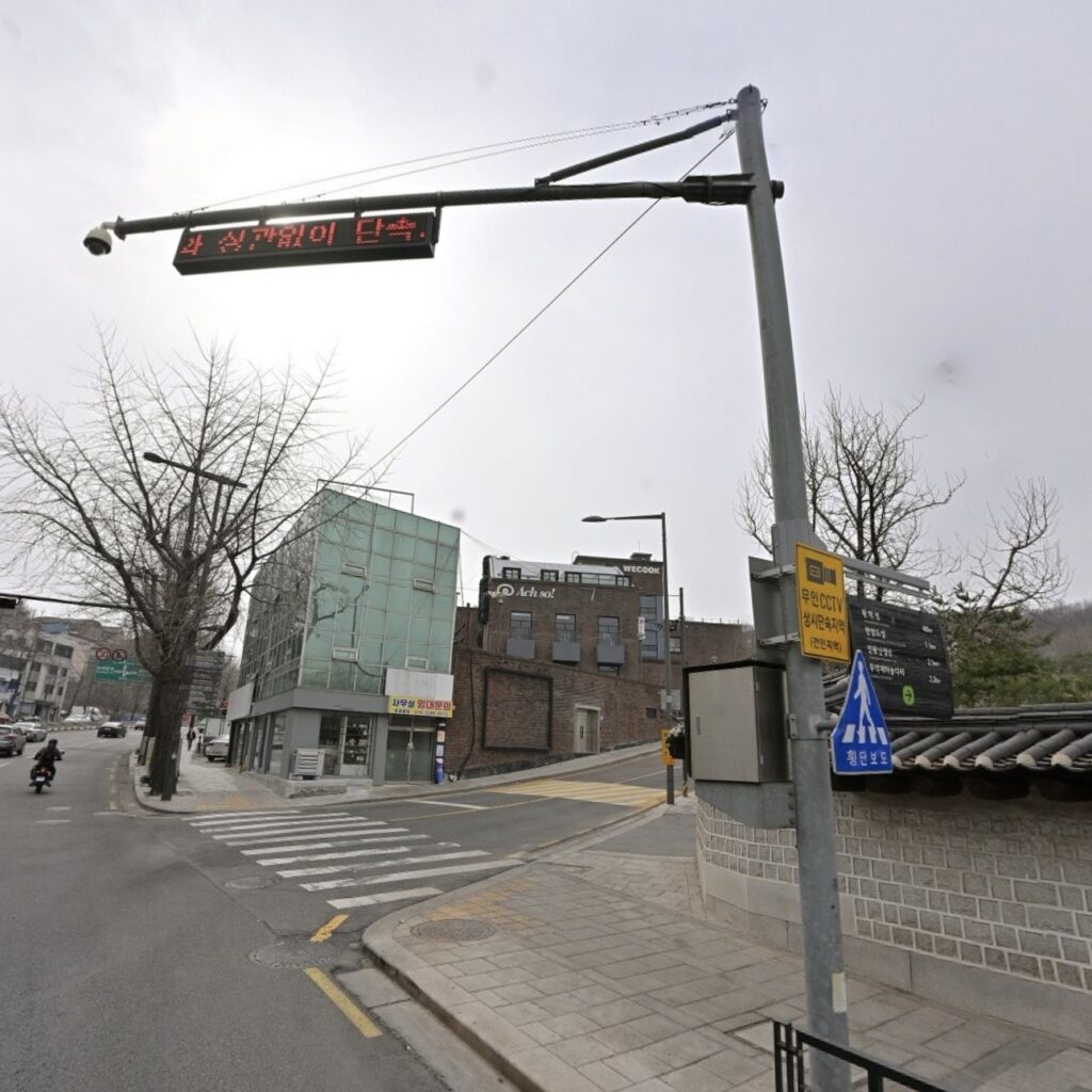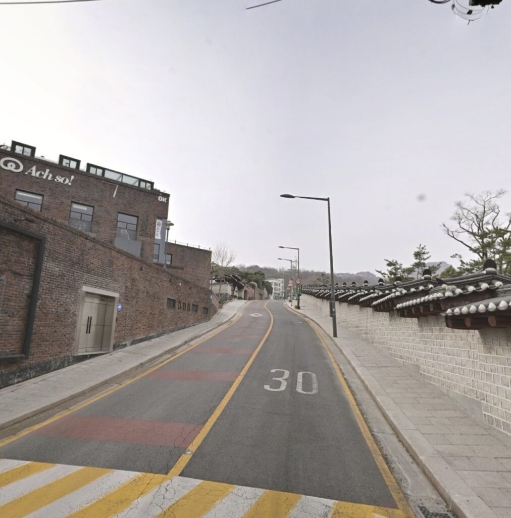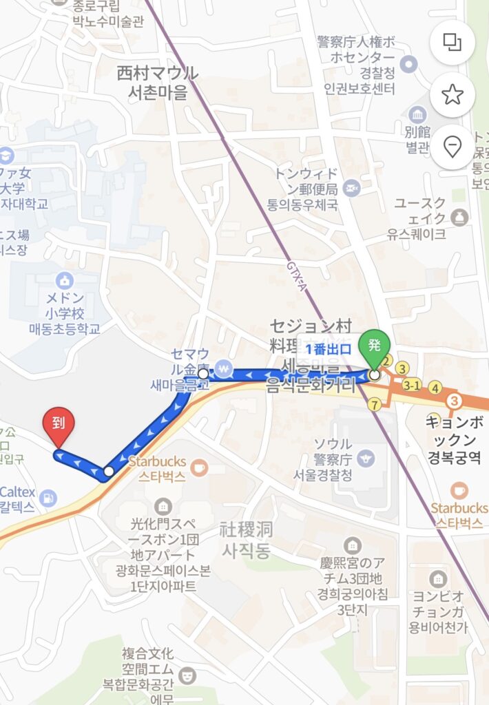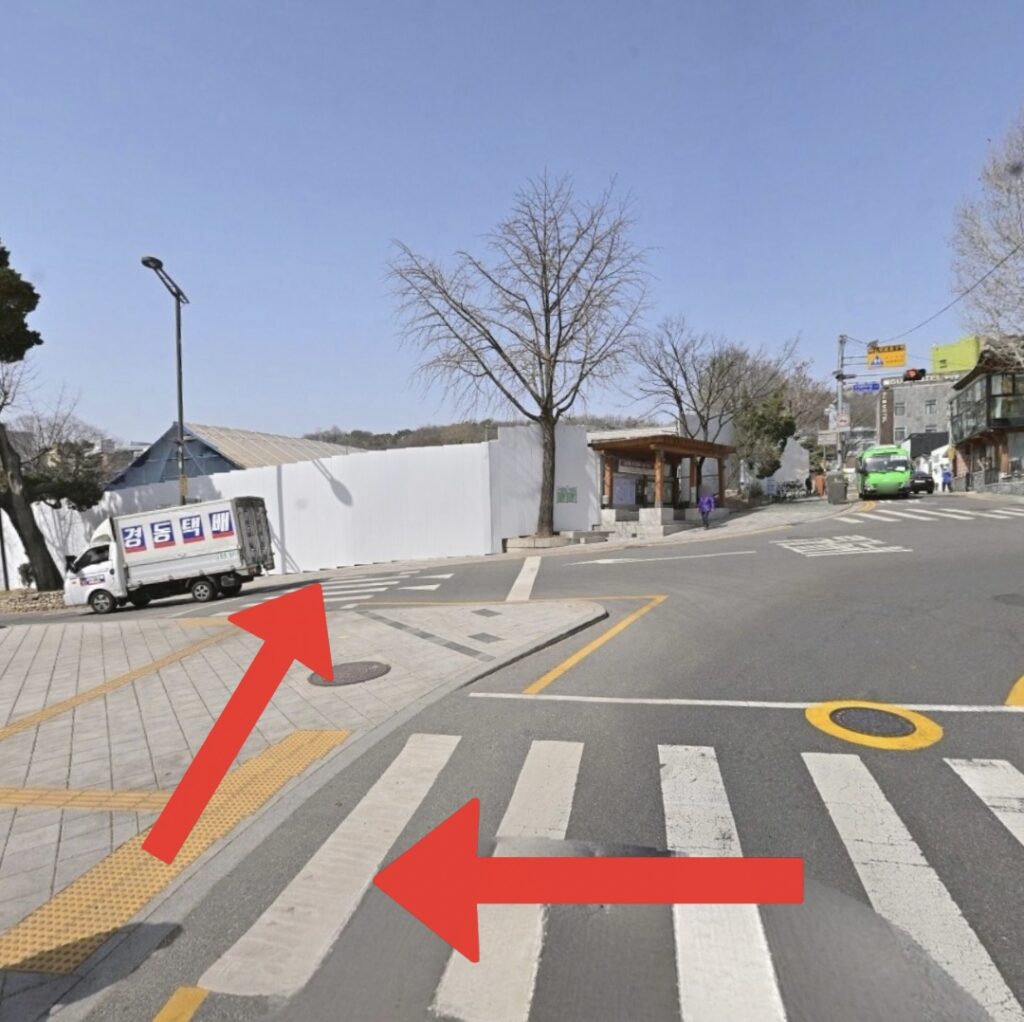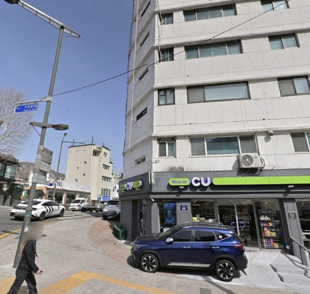 1番出口を出たらそのまままっすぐ歩き、現代自動車、セマウル金庫を通り過ぎた先にあるCU(コンビニ)前の信号を左に渡り、社稷公園(サジク公園)側に行きます。