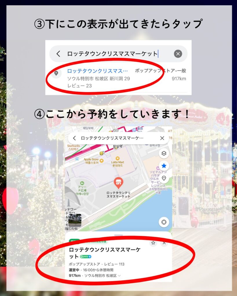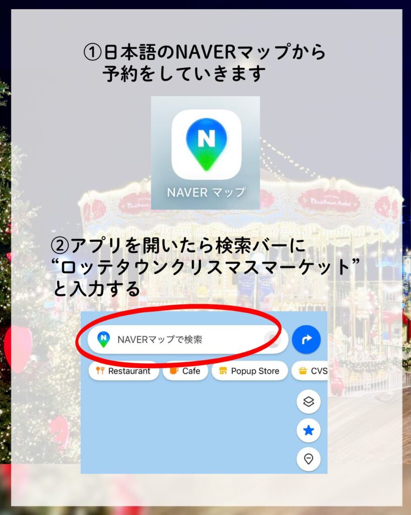 NAVERマップアプリは日本語表示に対応しており、「ロッテタウンクリスマスマーケット」と検索するだけで予約ページへアクセスできます。マップ上から会場の位置や周辺施設も確認できるため、旅行の動線づくりにも役立ちます。