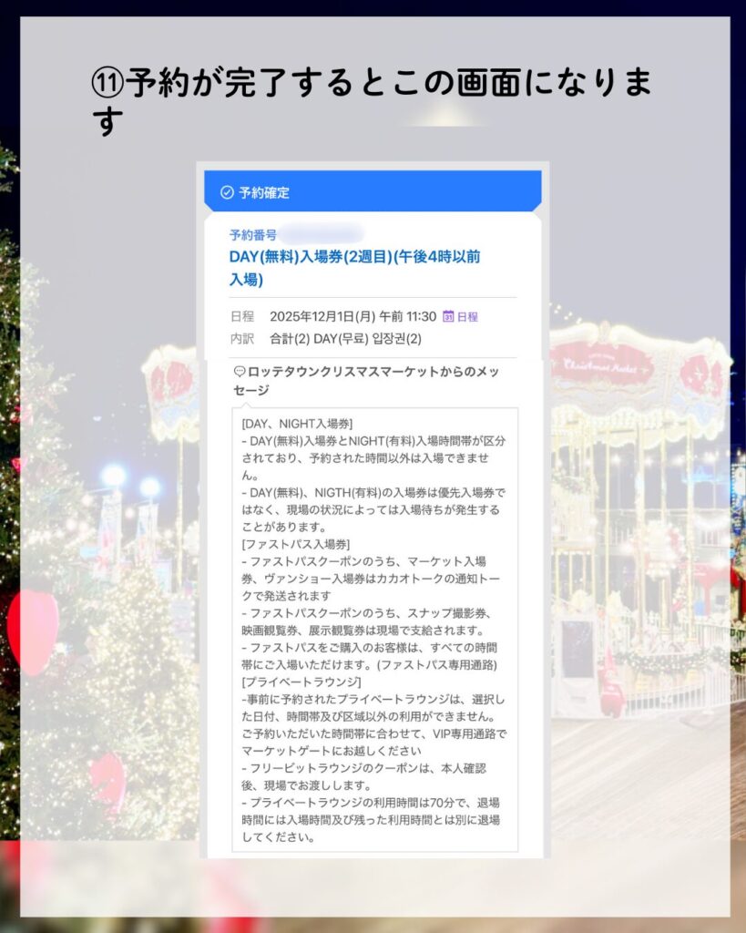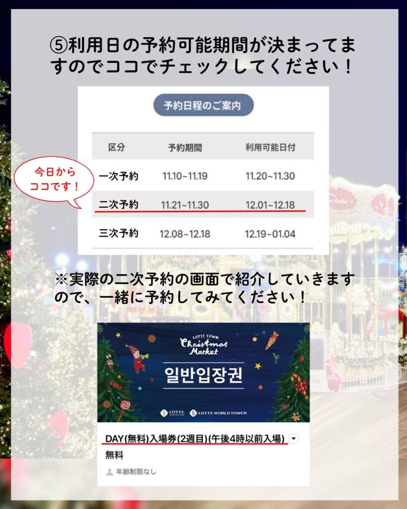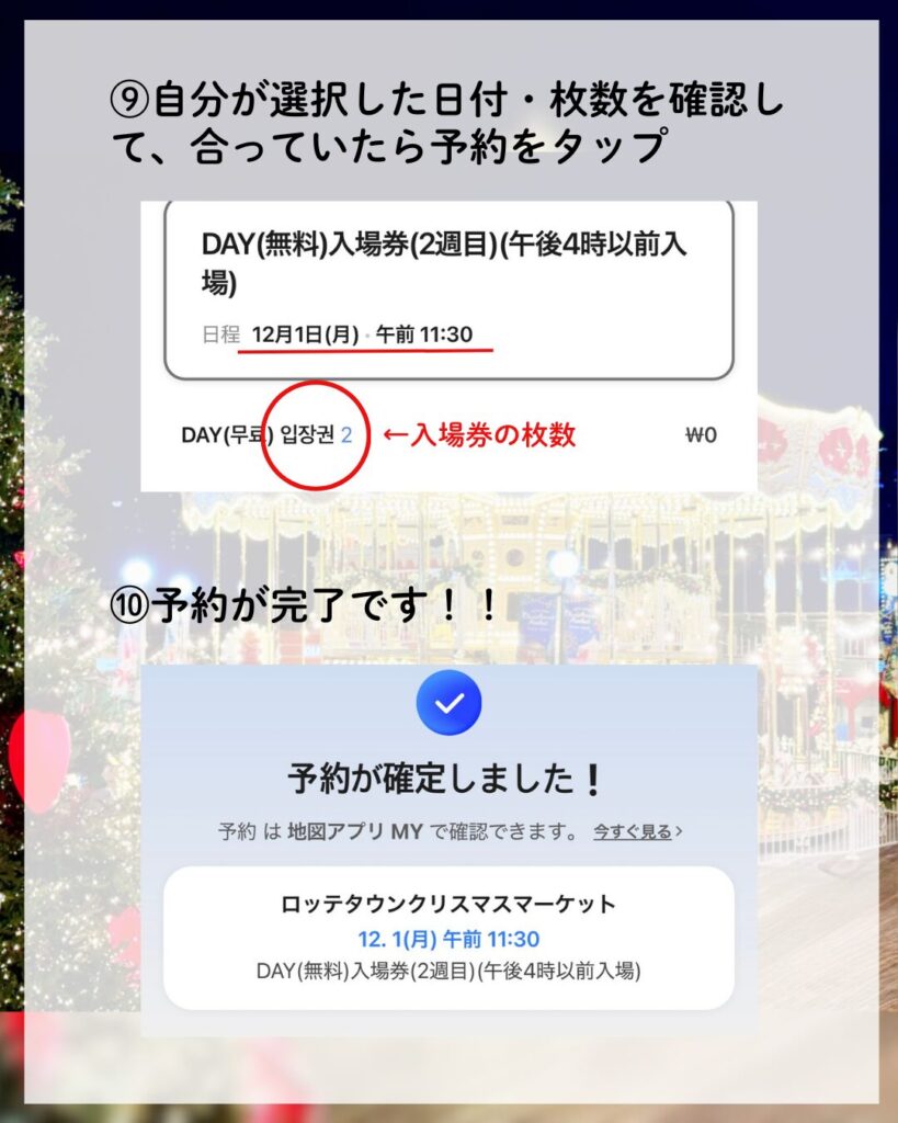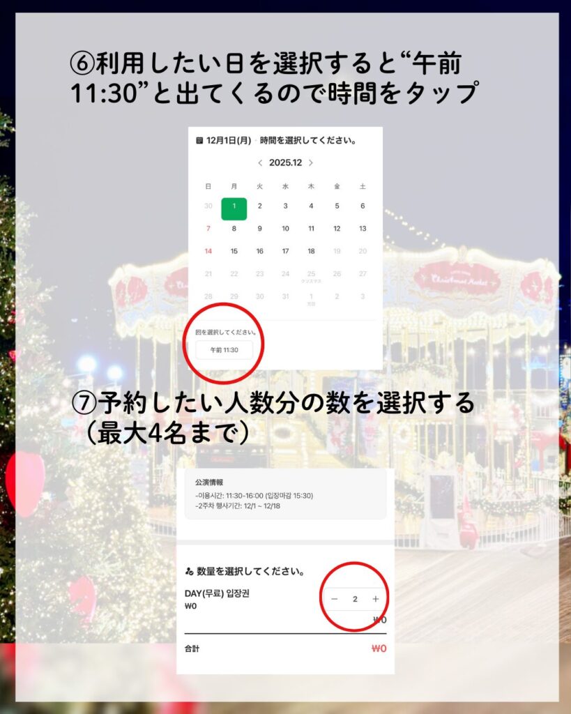 ロッテタウンクリスマスマーケットは来場者が非常に多いため、混雑を避けて快適に楽しんでもらうことを目的として 事前予約制 を採用しています。